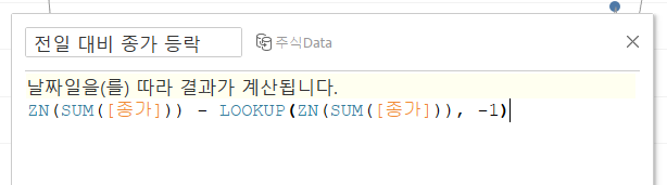 - 종가를 행 선반에 가져다 놓고, 퀵 테이블 계산을 이용해서 "차이"로 변경합니다.