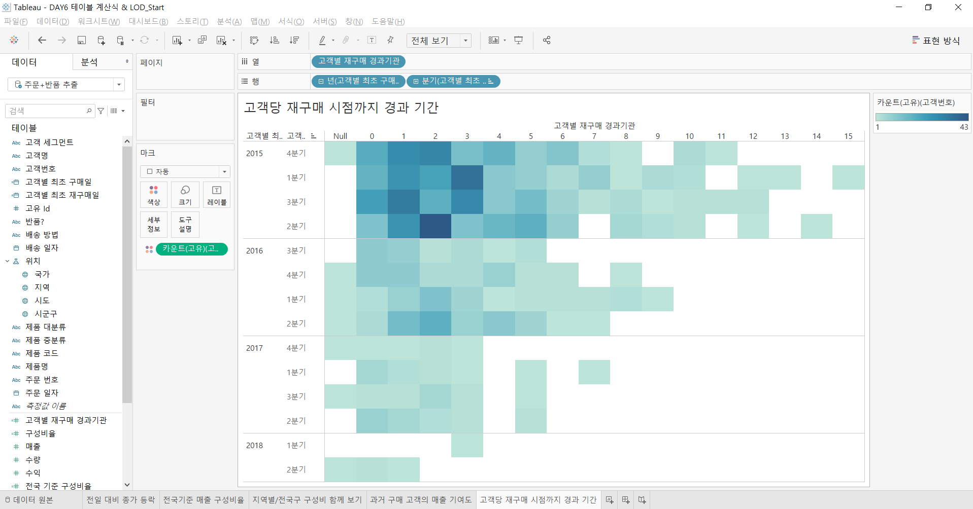 4. "고객별 최초 구매일"을 행 선반에 불연속형 년, 분기로 놓아줍니다.