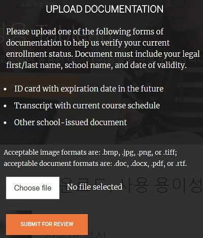 영문 재학 증명서, 국문 재학 증명서 전부 가능하다고 하는데요. 저 같은 경우는 국문 학생증으로 진행하였습니다.
