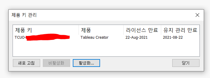 하나의 제품 키는 최대 두 번까지 활성화할 수 있습니다. 즉, 최대 두 대의 기기에 Tableau를 설치할 수 있습니다. 활성화 허용 횟수를 다 사용한 후 다른 기기에 설치하려면, 활성화한 제품 중 하��
