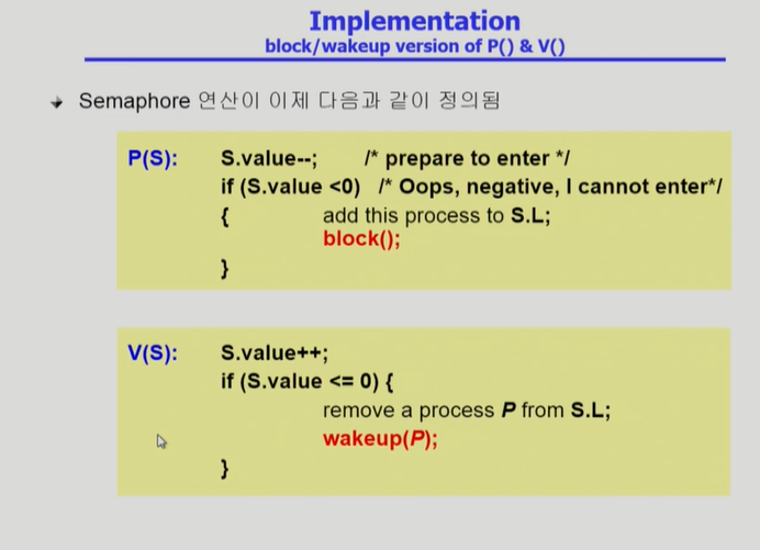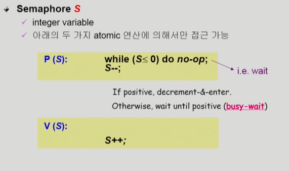 - P연산은 자원이 있으면 가져가는 것 여기서도 busy-waiting 문제는 생김