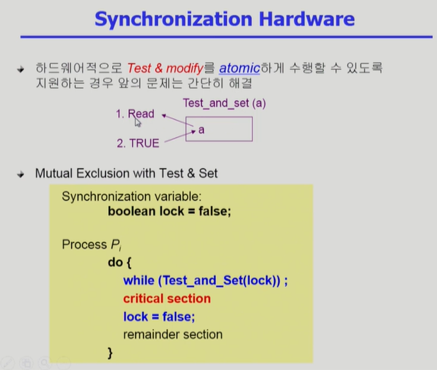 - Test_and_set(a) - 원래값을 읽어내고 1로 세팅하는 작업이다.