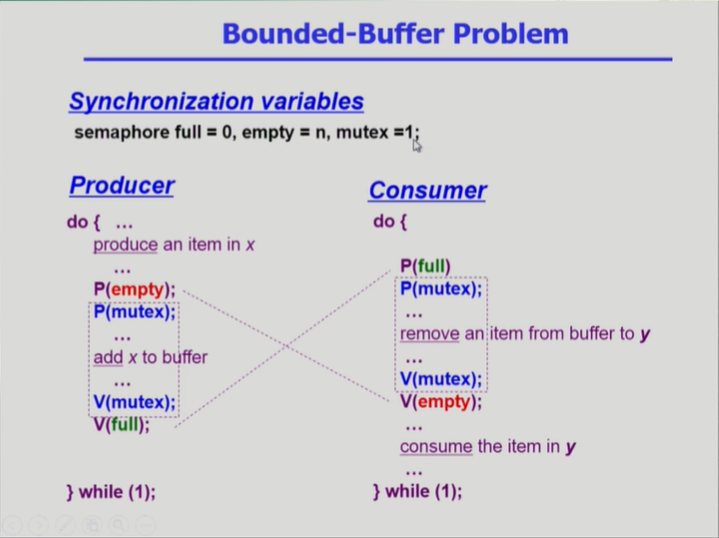 - 중간에 P(mutex) V(mutex)연산은 공유 버퍼에 대한 lock을 걸고 푸는 과정
