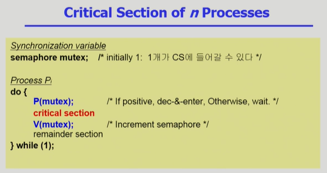 - mutual exclusion: shared data의 mutual exclusion을 위해 (binary semaphore)