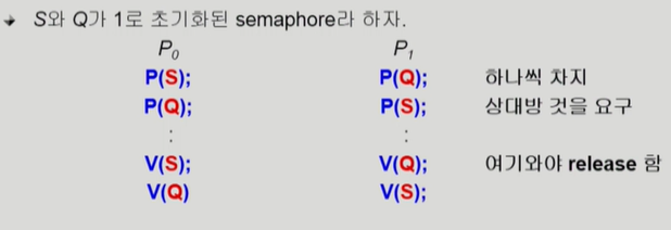 - P1도 P(S) P(Q)가 필요 P0가 P(S)를 쥐고 있고, P1이 P(Q)를 쥐고 있으면 둘다 무한히 기다림.
