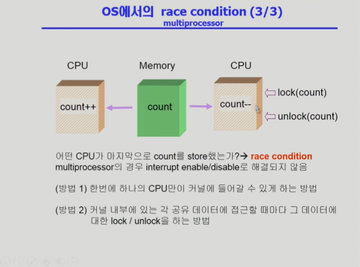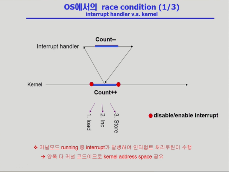 - 기존 커널 코드 작업이 끝날때까지 interrupt를 받아들이지 않는 방식으로 해결