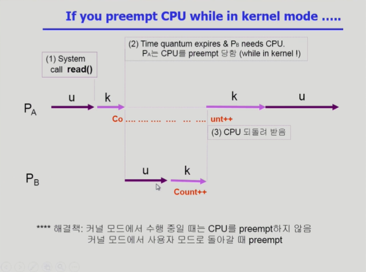 - 커널모드에서 수행중일 때는 CPU를 preempt하지 않음