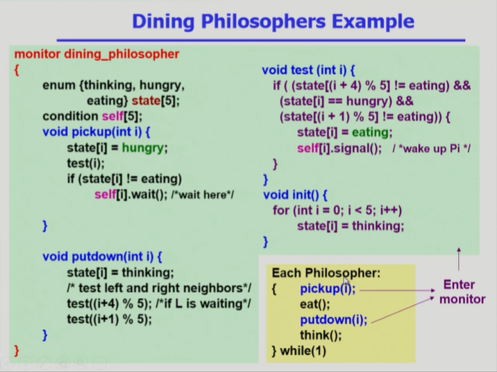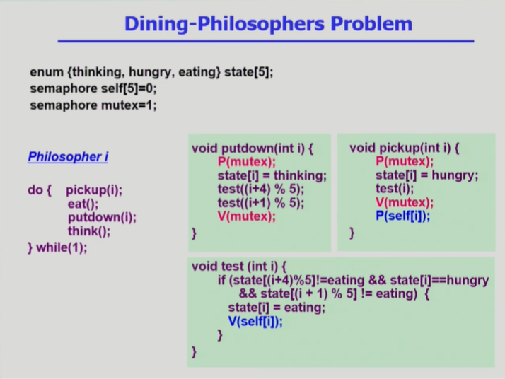 - P(self[i]) 부분에서 인접한 철학자가 V 해줄때까지 기다리게 된다.