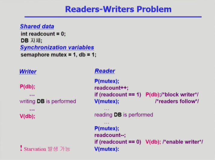 - readcount라는 공유변수에도 lock이 필요하다. 이게 P(mutex) V(mutex)이다.