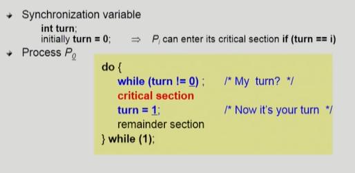- turn을 교대를 해가며 바꾸지만, 만약에 프로세스 자체가 실행이 안되거나 0번 프로세스만 계속 실행되면 조건 만족하지 못한다.