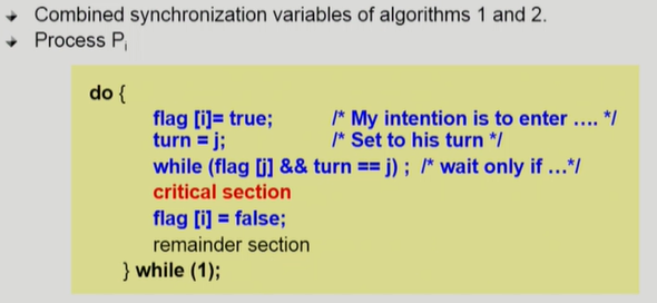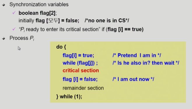 - 상대 flag가 있으면 계속 기다린다. critical section이 끝나면 flag를 false로 한다.