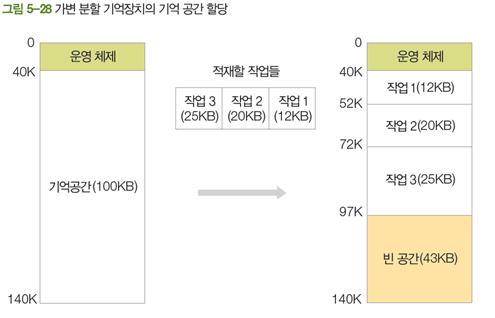 - 운영체제는 할당공간과, 가용 공간(hole)의 정보를 유지