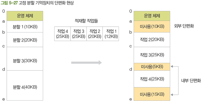 - 내부조각(Internal fragmentation): 프로그램 크기보다 분할의 크기가 큰 경우