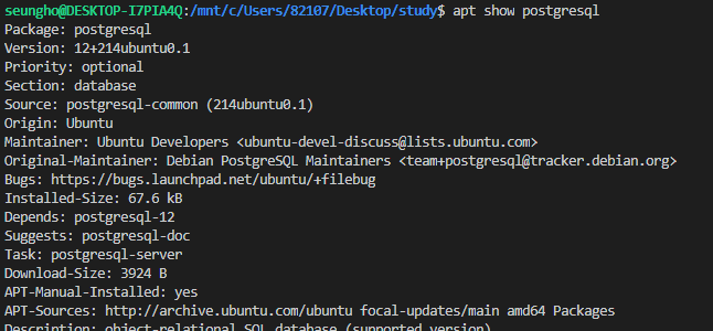 apt show postgresql 명령어를 치면 기본적으로 다운받는 psql에 대한 정보를 출력해 줍니다.