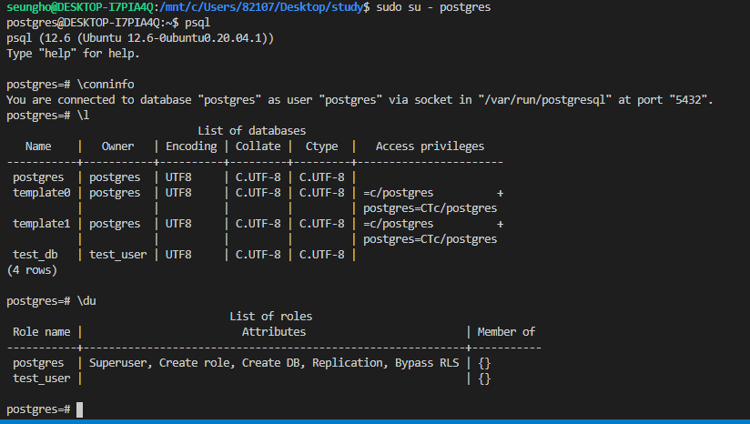 설치하면 기본적으로 ubuntu 내에 postgres라는 user를 만들고 postgres라는 role을 가지게 됩니다.