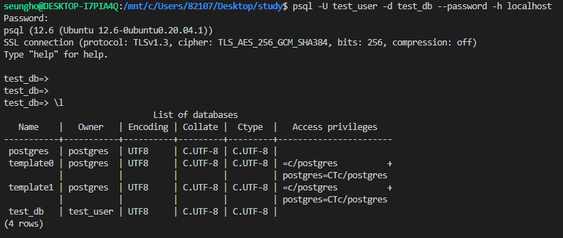 test_db와 test_user는 제가 생성한 것으로 밑에 설명하겠습니다.