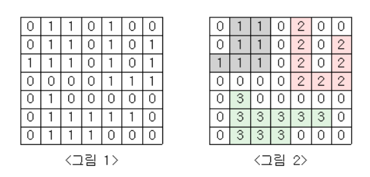 <그림 1>과 같이 정사각형 모양의 지도가 있다. 1은 집이 있는 곳을, 0은 집이 없는 곳을 나타낸다. 철수는 이 지도를 가지고 연결된 집들의 모임인 단지를 정의하고, 단지에 번호를 붙이려 한다. �