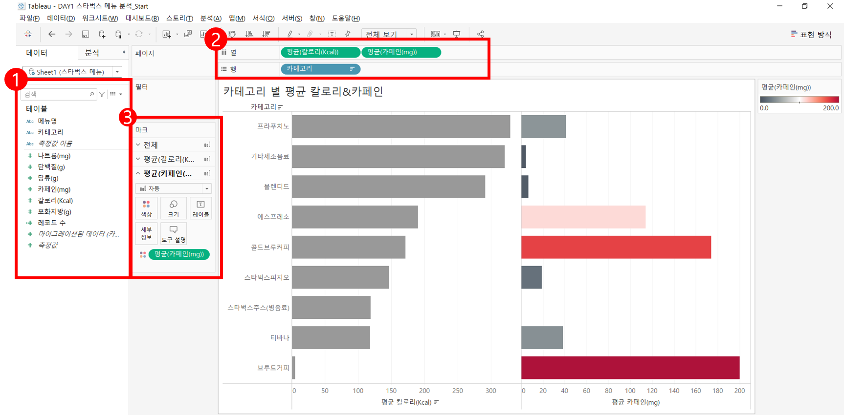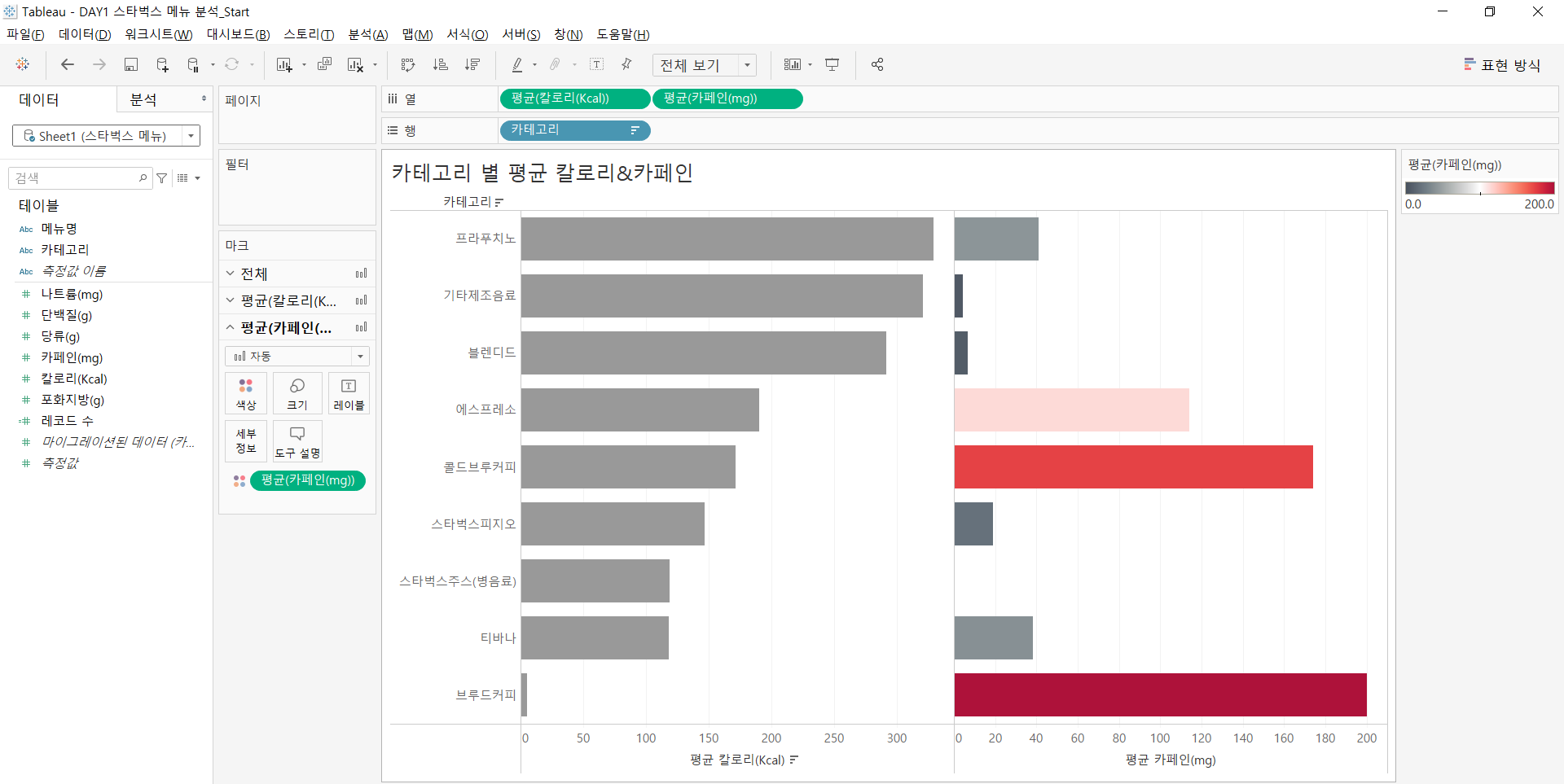 1. 카테고리를 행에 칼로리, 카페인을 열에 드래그 앤 드랍합니다.