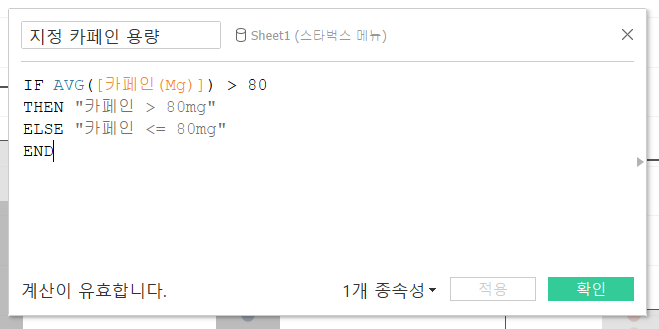2. 지정 카페인 용량이라는 계산식을 만듭니다